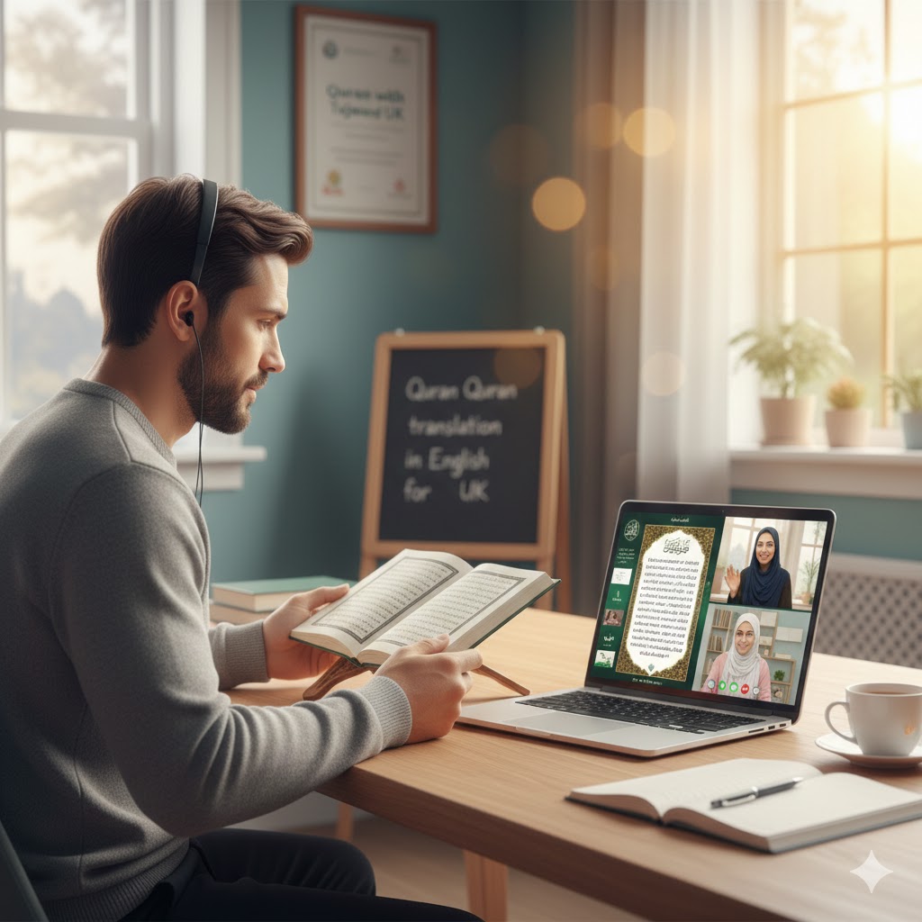 Master Quran recitation with correct Tajweed rules through one-to-one online Quran classes. Understand the Quran’s message with English translation and simple Tafsir, designed for beginners and foreign students. Quran with Tajweed UK, online Quran classes for adults, Quran translation in English UK, understand Quran online