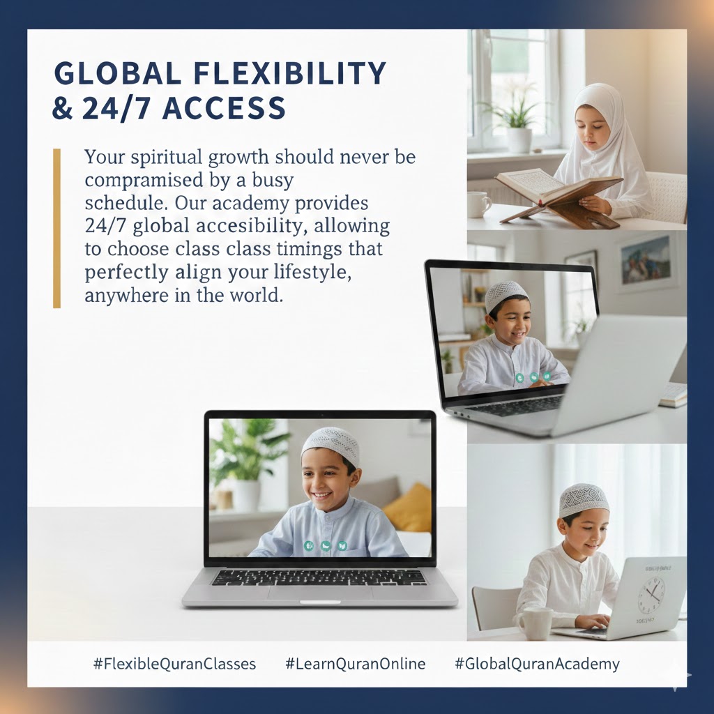 Your spiritual growth should never be compromised by a busy schedule. Our academy provides 24/7 global accessibility,allowing you to choose class timings that perfectly align with your lifestyle, anywhere in the world. #FlexibleQuranClasses #LearnQuranOnline #GlobalQuranAcademy